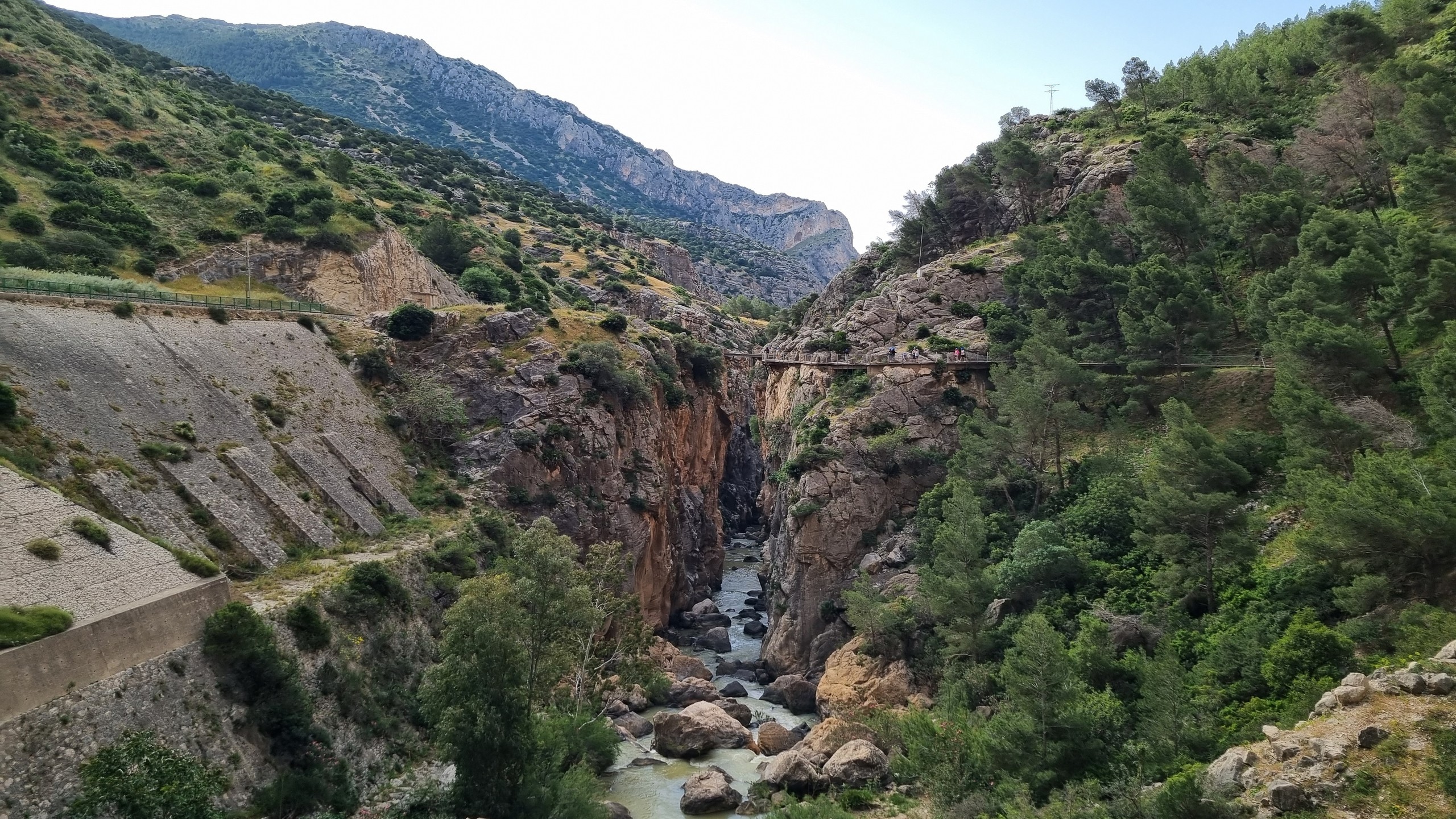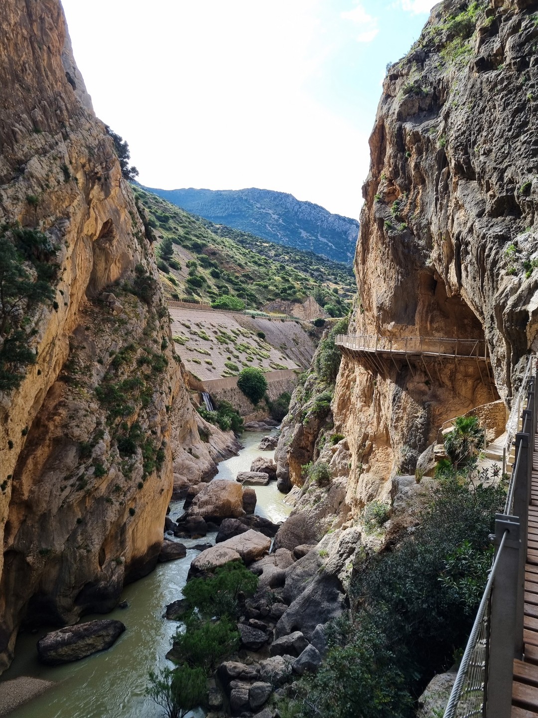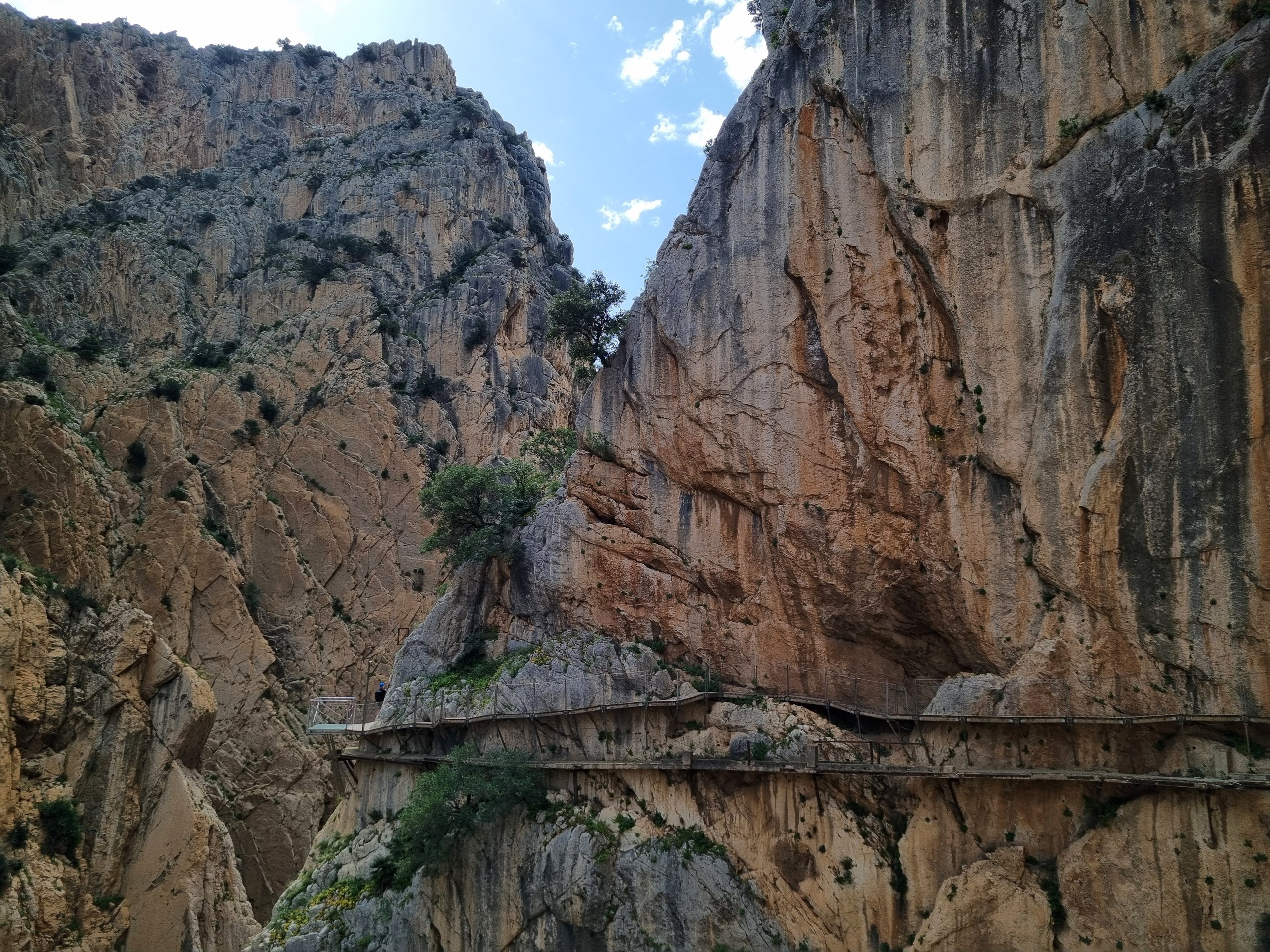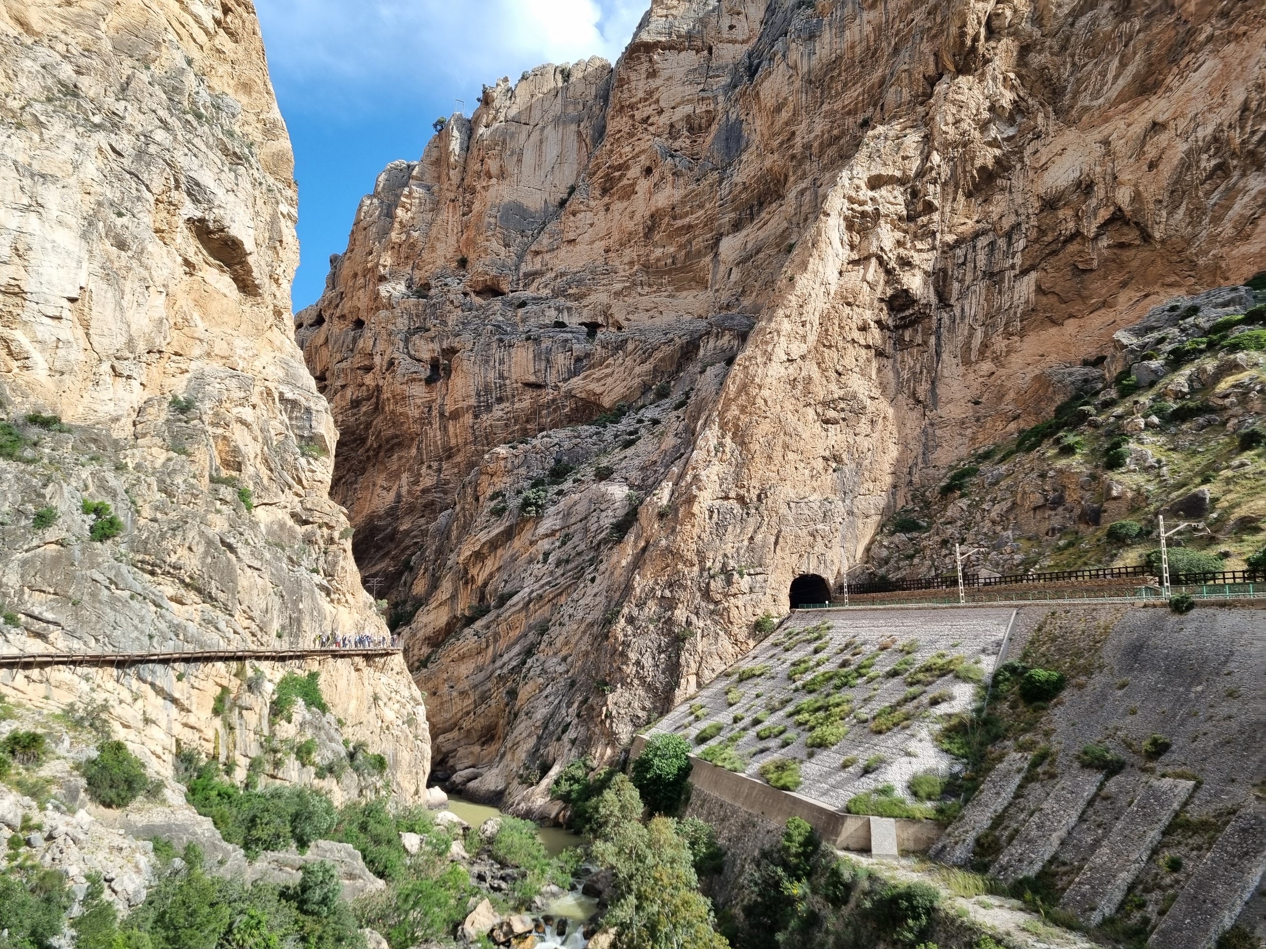 Caminito del Rey – Ścieżka Króla. Kiedyś przejście tylko dla odważnych (po wypadkach śmiertelnych oficjalnie zamknięte w latach 2000-2015). Teraz niedzielna wycieczka piknikowa. W roku 2014 trasa w wąwozie została zbudowana na nowo. Zawieszono zabezpieczone podesty odpowiednie dla turystyki masowej. Może taka kolej rzeczy. Większość turystów stanowią dzisiaj zorganizowane grupy z przewodnikami. W sezonie pewnie ciężko kupić bilety indywidualne bez sporego wyprzedzenia. Są oczywiście określone godziny wejścia, trzeba płacić za parking i shuttle busy. Można to zaakceptować jak się jest na lajtowym wyjeździe na przedłużony weekend w Andaluzji ;-). Najważniejsze, że zostały widoki, a przejście wysoko nad dnem wąskiego wąwozu wydało mi się całkiem atrakcyjne. No i zawsze to 8km spaceru + zaliczona atrakcja.