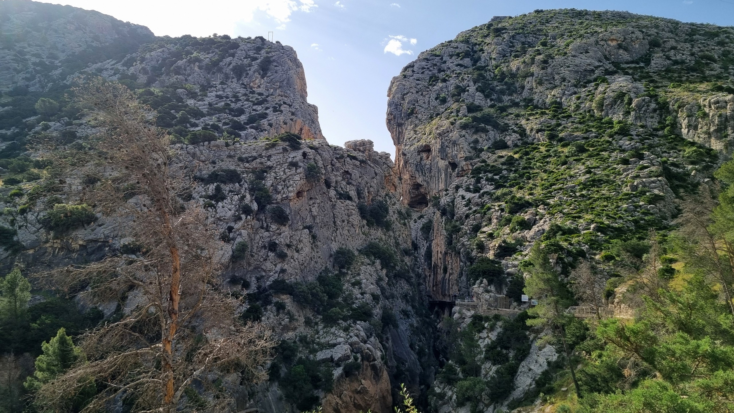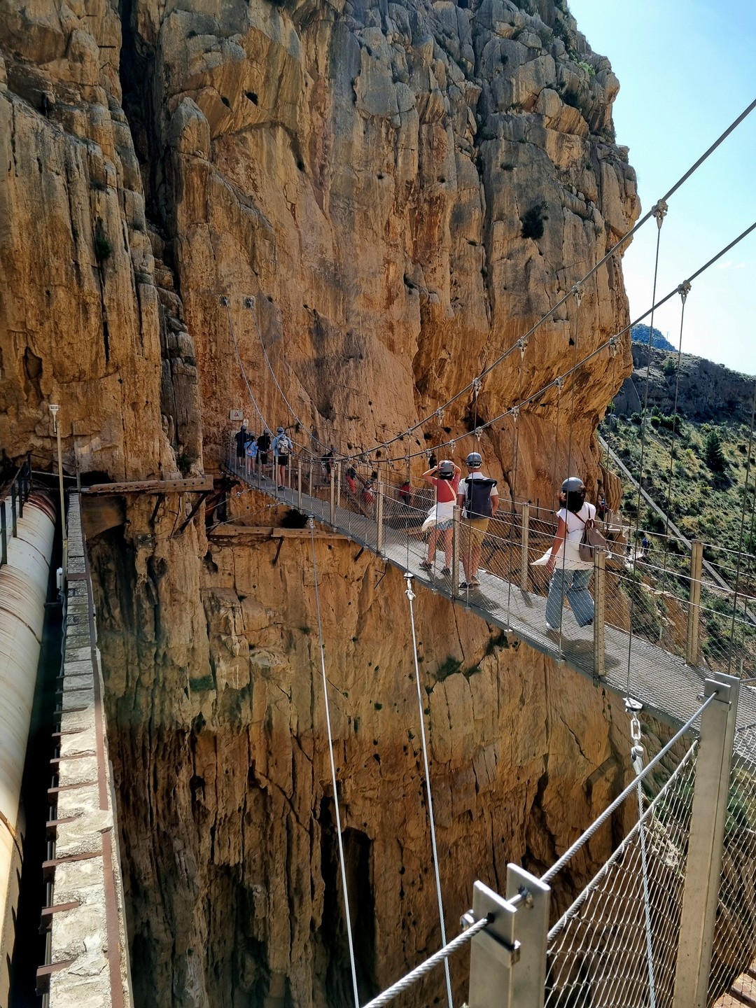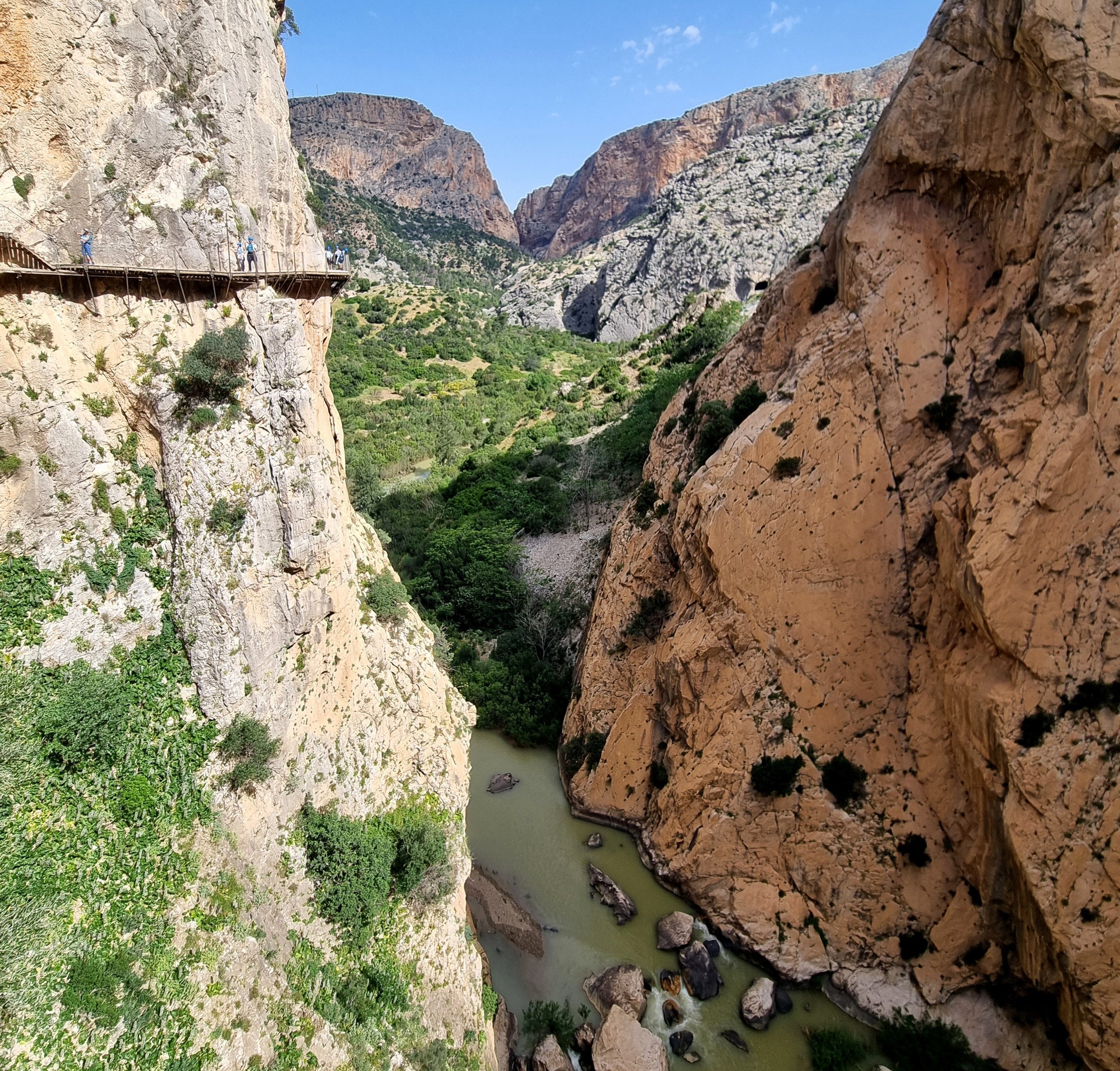 Caminito del Rey – Ścieżka Króla. Kiedyś przejście tylko dla odważnych (po wypadkach śmiertelnych oficjalnie zamknięte w latach 2000-2015). Teraz niedzielna wycieczka piknikowa. W roku 2014 trasa w wąwozie została zbudowana na nowo. Zawieszono zabezpieczone podesty odpowiednie dla turystyki masowej. Może taka kolej rzeczy. Większość turystów stanowią dzisiaj zorganizowane grupy z przewodnikami. W sezonie pewnie ciężko kupić bilety indywidualne bez sporego wyprzedzenia. Są oczywiście określone godziny wejścia, trzeba płacić za parking i shuttle busy. Można to zaakceptować jak się jest na lajtowym wyjeździe na przedłużony weekend w Andaluzji ;-). Najważniejsze, że zostały widoki, a przejście wysoko nad dnem wąskiego wąwozu wydało mi się całkiem atrakcyjne. No i zawsze to 8km spaceru + zaliczona atrakcja.